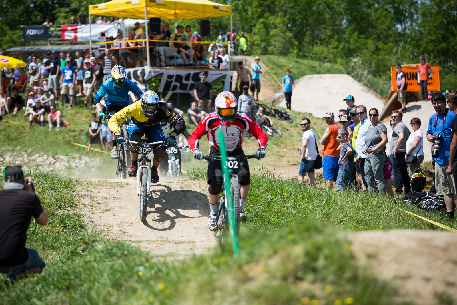 Am nächsten morgen war das Orga-Team schon früh auf den Beinen. Das Wetter hielt was es versprach, es war ein wolkenloser Himmel und es hatte an die 25°C. Die 4Cross und Slopestyle fahren staunten nicht schlecht was da für ein Slopestyle-Kurs gebaut wurde. Das 4Cross Training begann früh, daher stand schnell das Fahrerfeld statt. Insgesamt 95 Fahrer und davon 26 Elitefahrer das bedeutet 32er-Finale und viel Action. Weltmeister Aiko Göhler war vor Ort, sowie Wm Teilnehmer Tom Scherer, Jonas Gauß, Marvin Schaub, der Schweizer WM 3. von 2014 Simon Waldburger und Deutsche 4Cross Meisterin Katrin Karkhof. WM 3. 2015 Benedikt Last ist leider durch das aussetzten des Pumptrack-Rennens auch nicht fitter geworden und muss weiter pausieren. Die Quali beginnt und die Favoriten setzen sich ab.